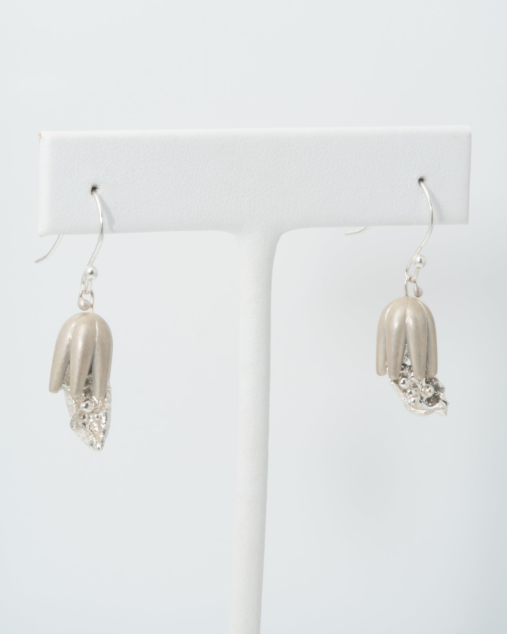 Handcrafted by Abigail Leaventon, these gorgeous earrings feature a cupped organic form with a dangling silver nugget flowing from the center. The uniformity of the cupped form contrasts nicely with the irregular form of the silver nugget. These earrings use a combination of sterling silver and fine silver.