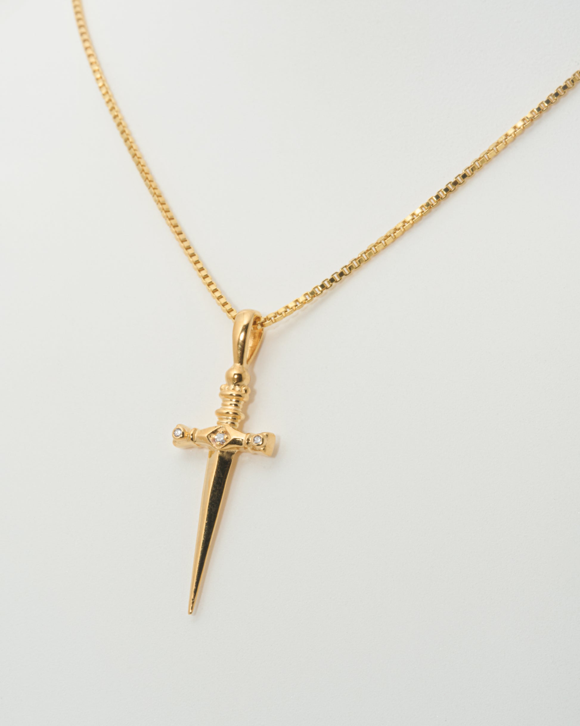Made by Awe Inspired, this 14K gold vermeil pendant is shaped like a small sword with diamonds decorating its handle. The design is dainty, intricate, and sculptural. It sits on an 18-inch adjustable box chain.