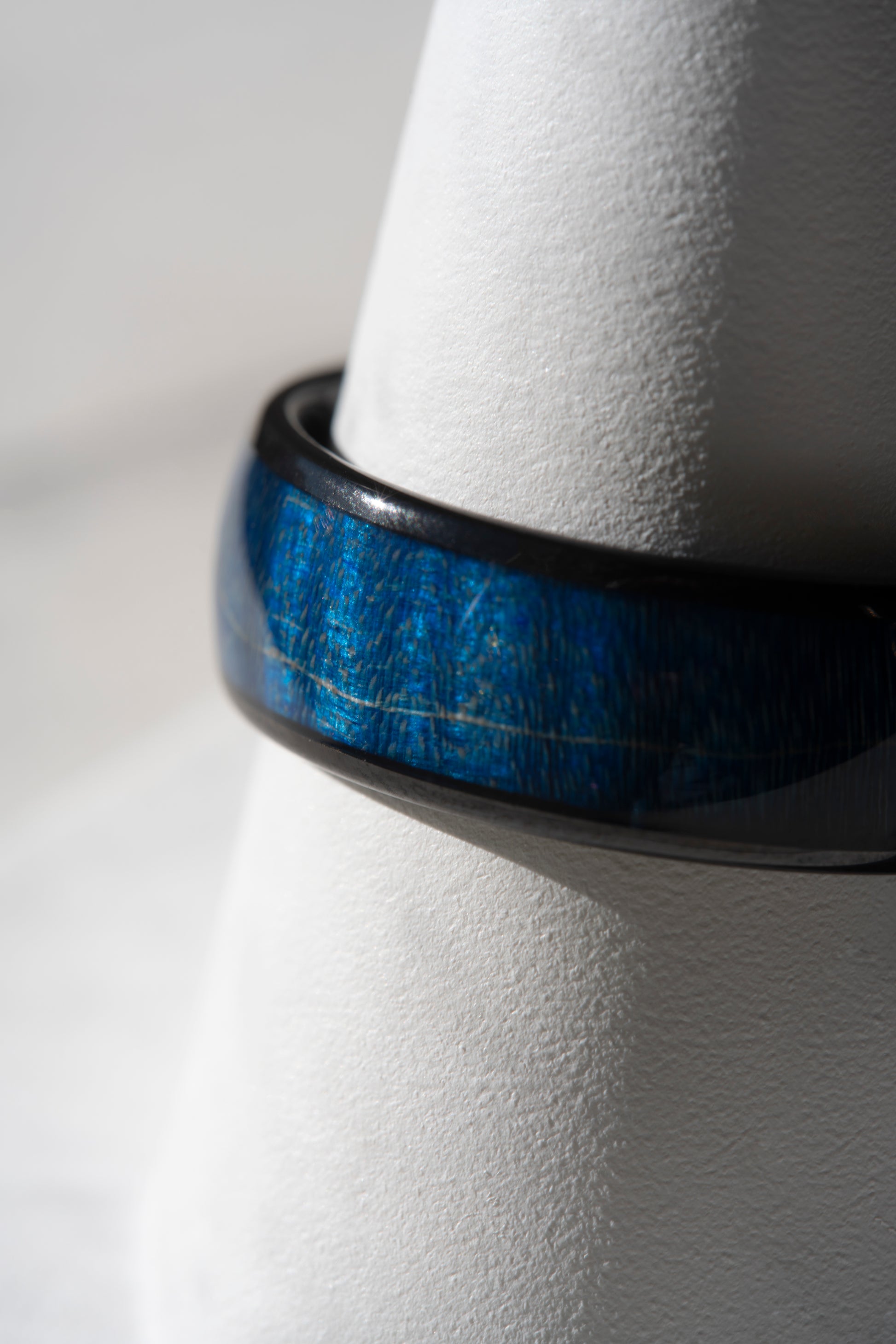This stunning 8mm wide band is crafted with dyed azure wood inlay, offering a deep blue and serene aesthetic. The black-plated tungsten exterior provides durability, while the comfort fit interior ensures a perfect fit. Elevate your style with this unique and charismatic ring in size 10. This ring can be ordered in alternative sizes.