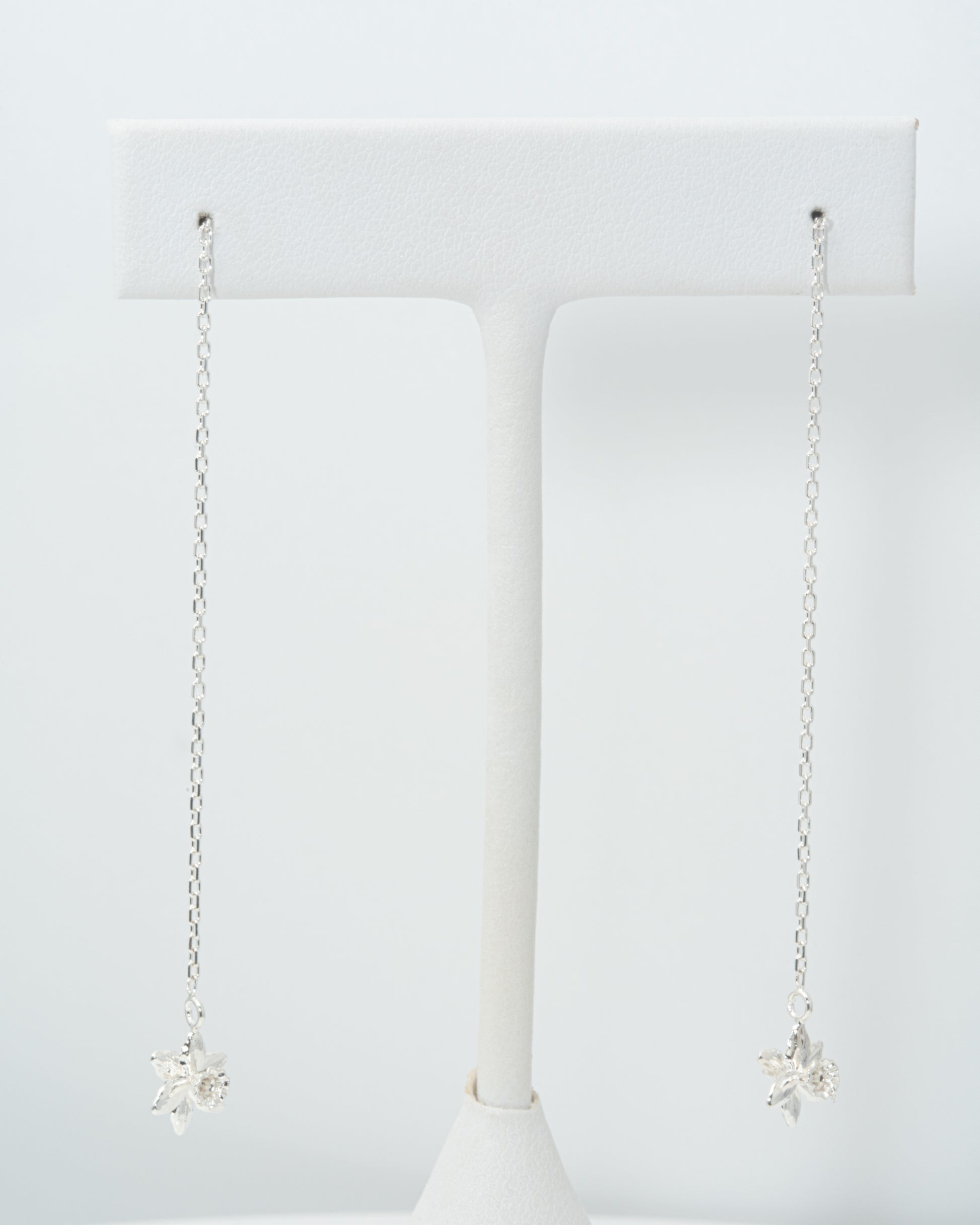 Handcrafted by Abigail Leaventon, these threader earrings feature a petit daffodil hanging from the end of a chain. The daffodils are intricately textured and detailed. These earrings have been crafted from solid sterling silver.
