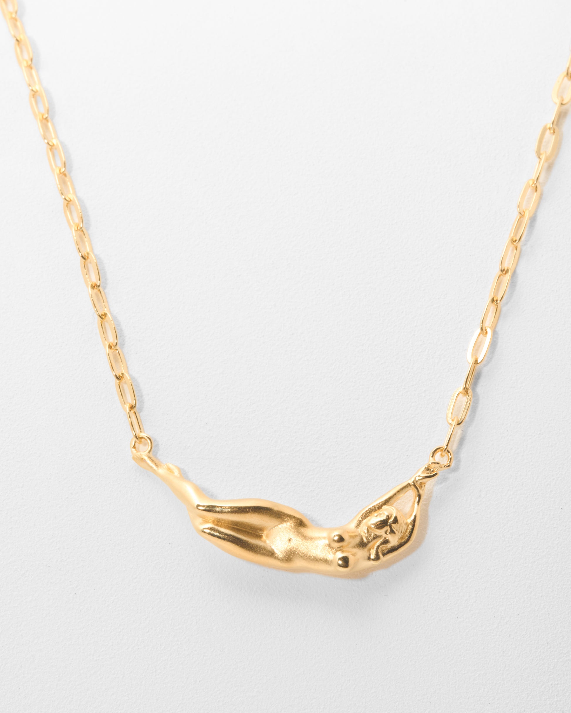 Made by Awe Inspired, this 14K gold vermeil necklace depicts a sculptural figure of a woman lying on her side. The form of the woman is slightly curved, and the chain connects at her hands and at her feet. Her face is gazing upwards, with her styled hair falling on her shoulders. This necklace is intended to be a depiction of the divine feminine form and is a truly unique work of art. It sits on an 18-inch adjustable paperclip chain.