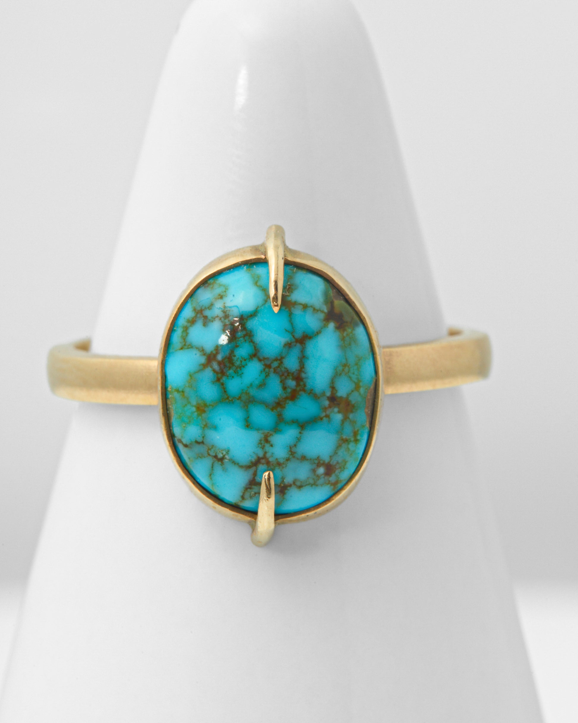 Handmade by Melissa Cohen, owner of Metal Sugar Jewelry, this beautiful oval turquoise sits in a hand-crafted claw prong bezel setting. This gorgeous ring is solid 14K yellow gold with a glowing oval turquoise cabochon. It is currently a size 5 3/4, but we are able to resize it for you if needed.