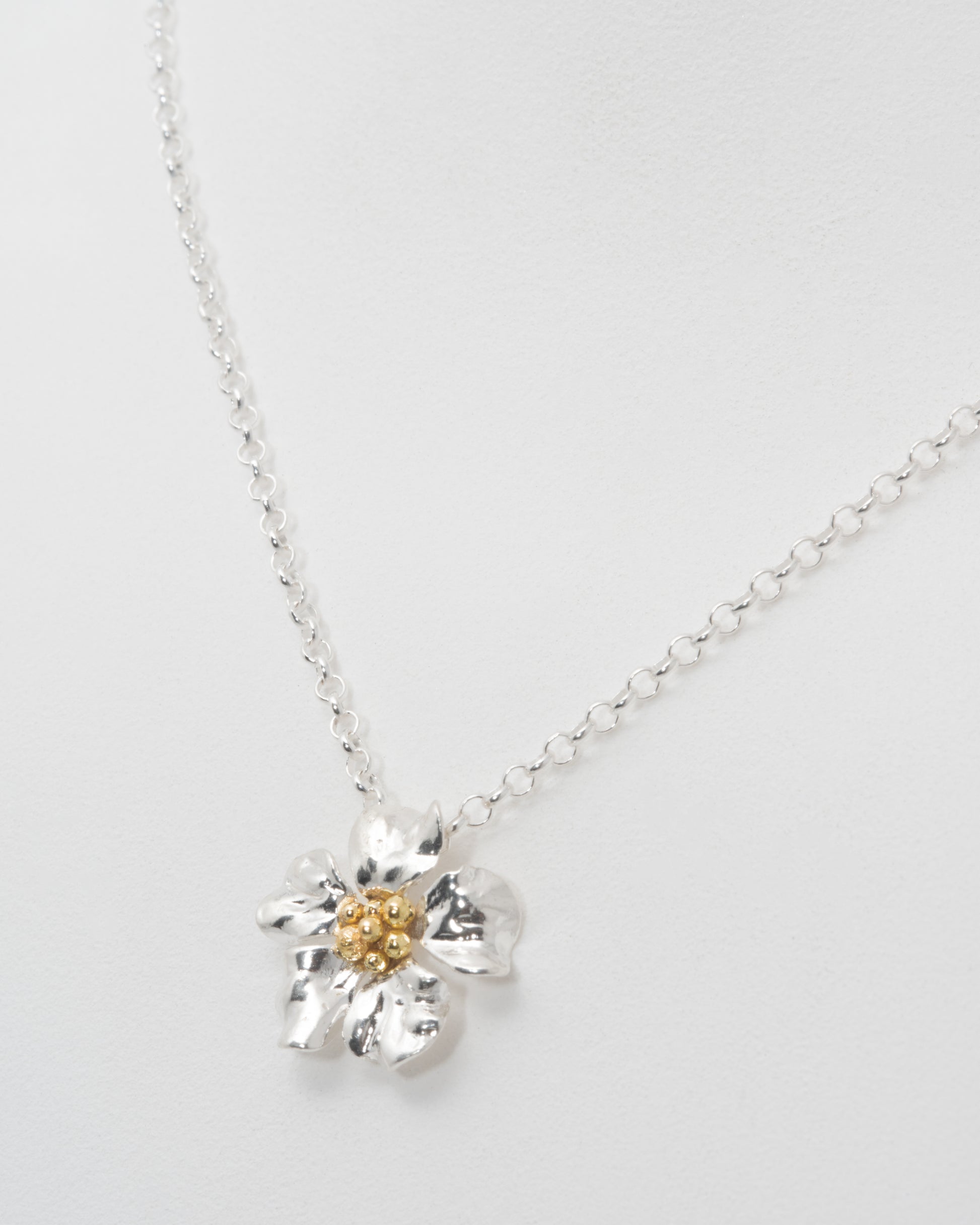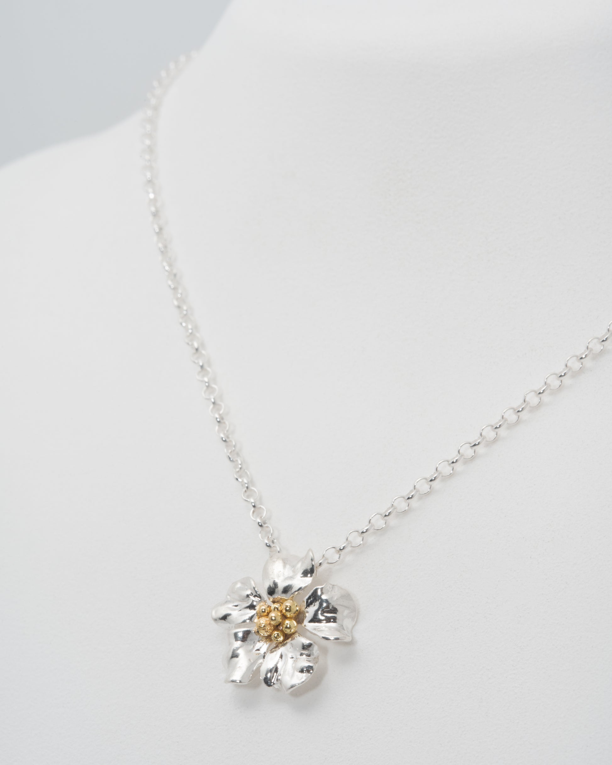 Handcrafted by Abigail Leaventon, this elegant necklace features a sterling silver geranium flower centered with a solid 18K gold cluster of pollen. The petals of the flower have an intricate organic texture that adds to the realism of the piece. This necklace sits on an adjustable 20-inch sterling silver chain.