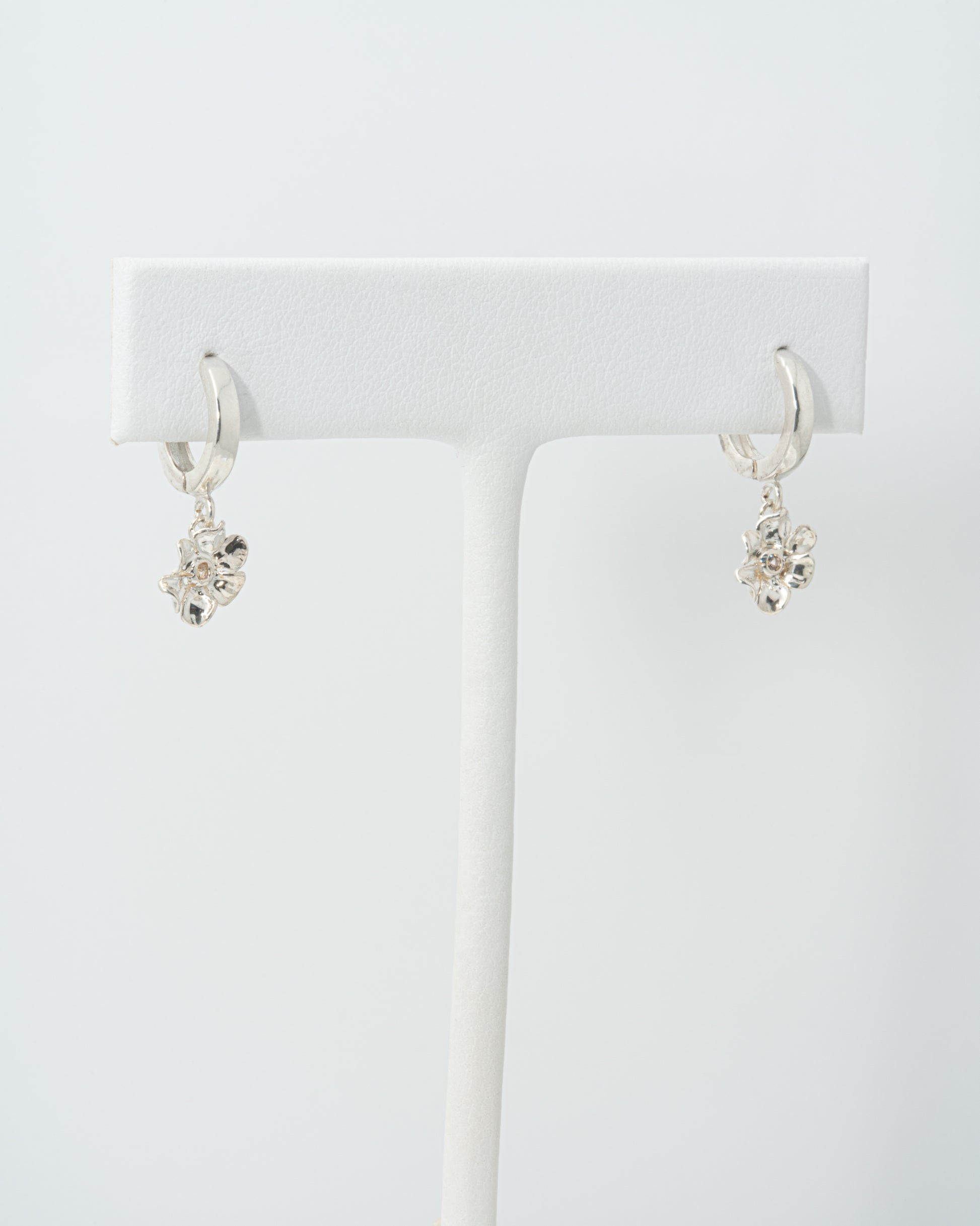 Handcrafted by Abigail Leaventon, these earrings feature two dainty silver geraniums dangling from a pair of small hoops. The center of each flower contains a gorgeous sparkling white sapphire. These earrings have been crafted in solid sterling silver.
