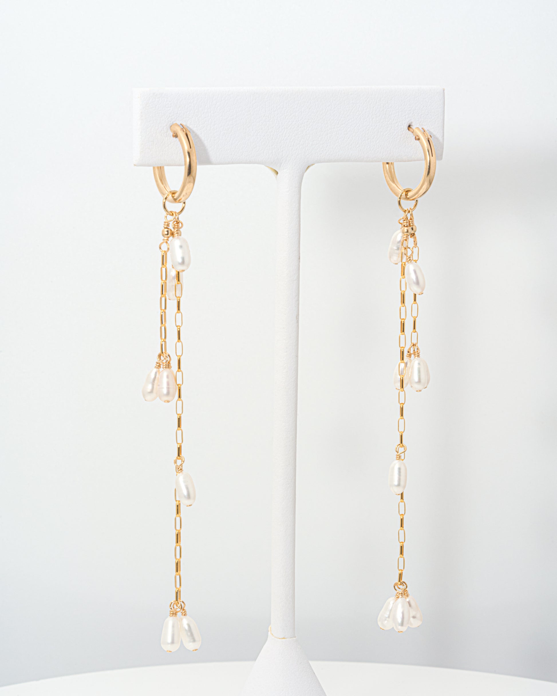 Made by Christine Elizabeth Jewelry, these gorgeous 14K gold-filled earrings feature an arrangement of pearls dangling from chains with a gold hoop at the base. The arrangement of pearls looks like a cascade of falling flower petals, hence the name of the earrings “Falling Petals”.