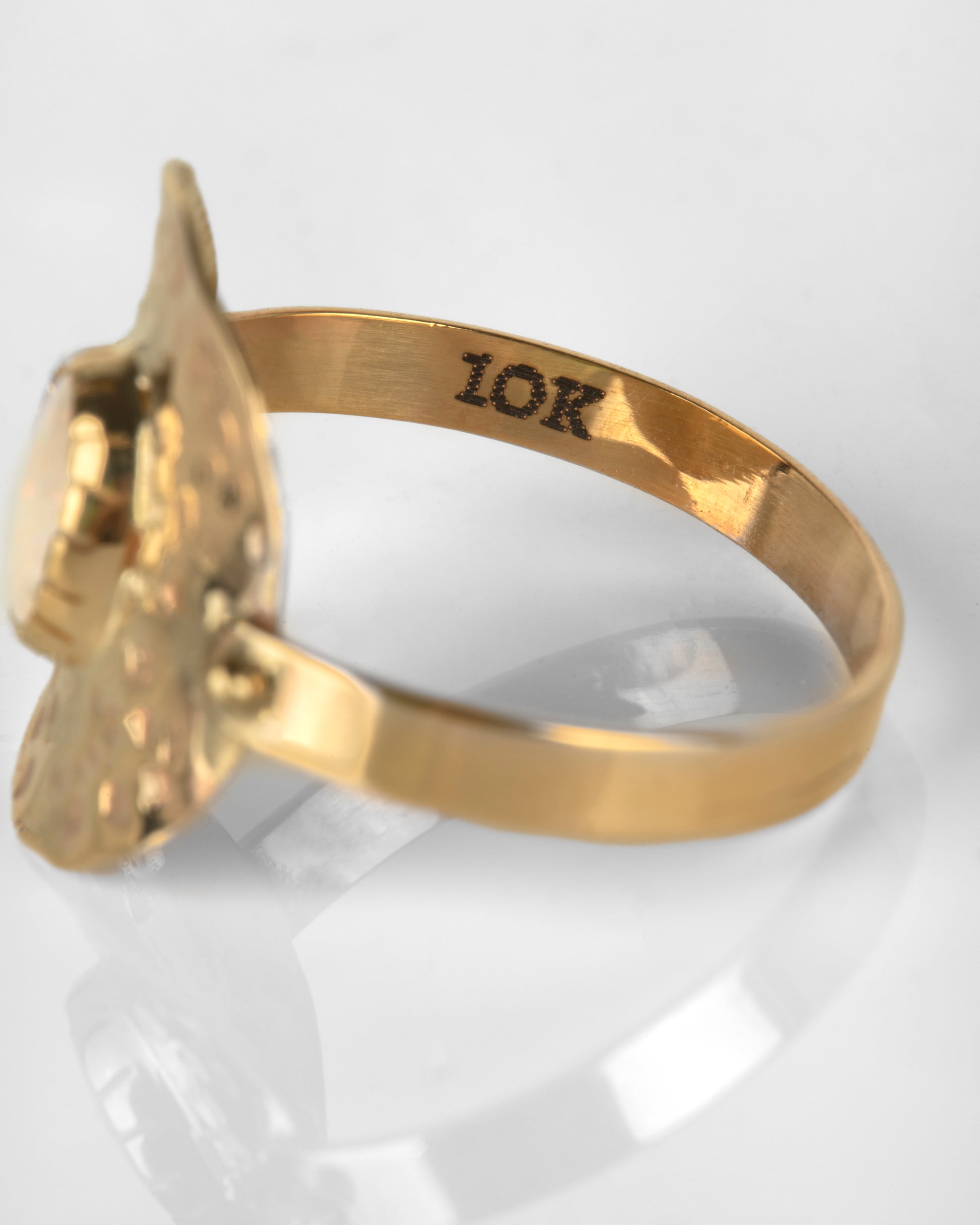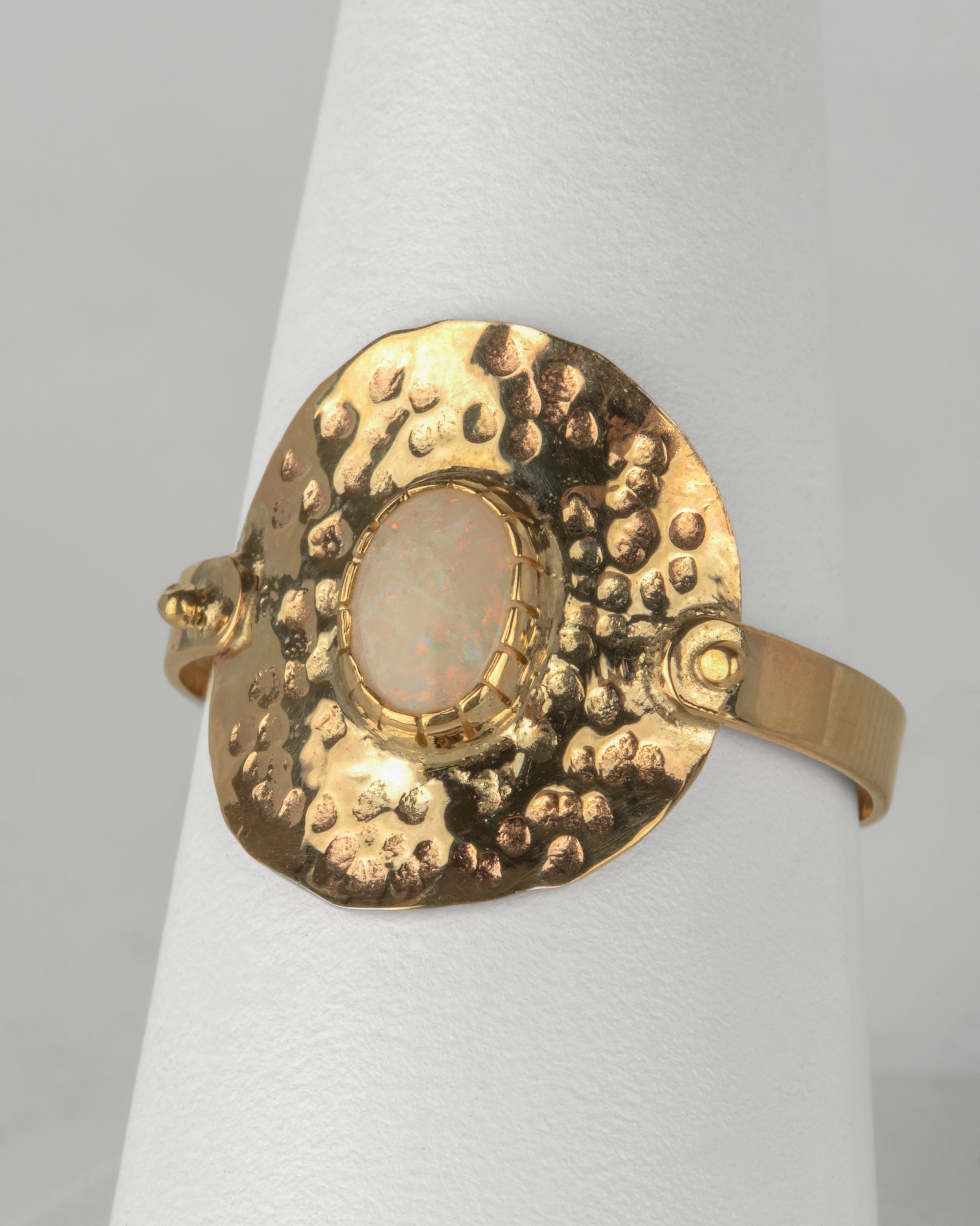 Handmade by Jay Chughtai, this ring features a bezel-set Australian opal framed by a round textured back plate. It has a flat band for comfort with a faux rivet to balance the weld. This opal cabochon has a warm white base with green, orange, and pink flashes. This ring is is made of 10K Yellow Gold and a Size 8. Please reach out if you are interested in having it sized to your finger!