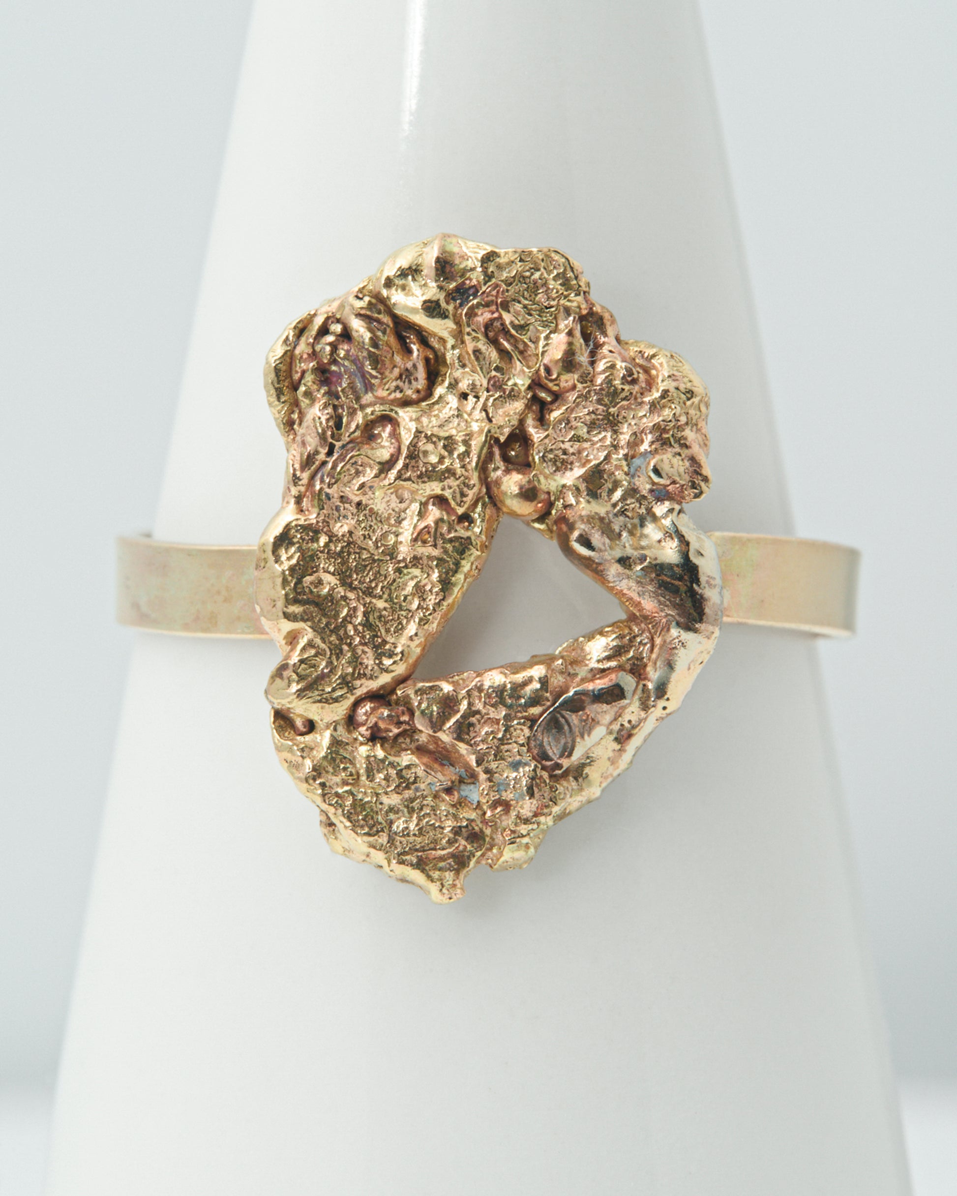 Handmade by Jay Chughtai, this organic ring is an ode to the material it comes from- natural gold nuggets. The ring is made of solid 10K Yellow Gold and crafted to look like a natural formation of gold underground. This ring features a flat comfortable band to balance out the textural main feature. This ring is made in a Size 9.5 but can be sized just for you.