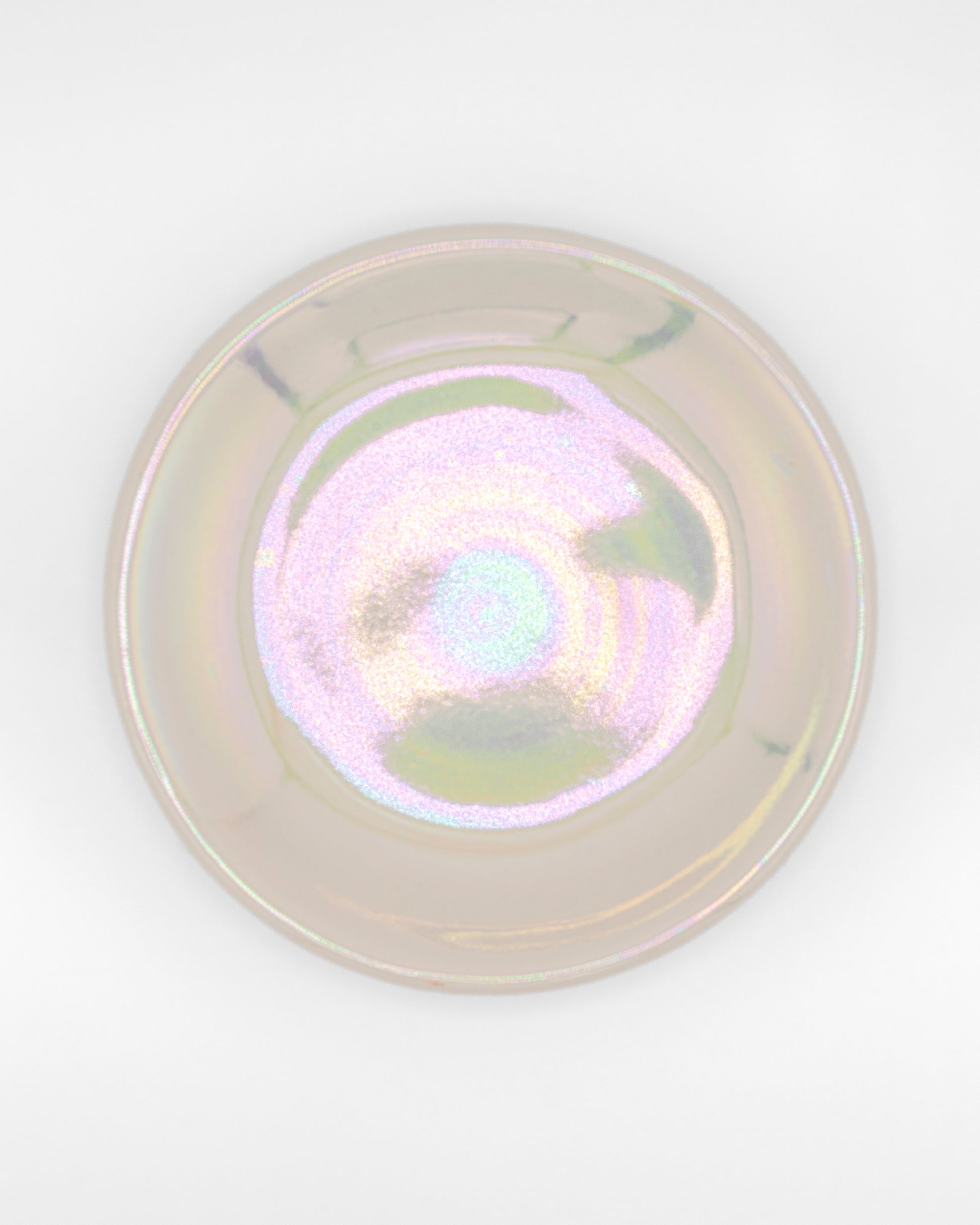 Handmade by Sophia Keys of Apricity Ceramics, this beautiful iridescent jewelry dish is perfect for holding rings, necklaces, and other jewelry pieces. It is coated in a gorgeous hand-mixed iridescent paint that shines pink, blue, and green in the light. Each dish measures 4” across, making it a great choice if you are looking for something big enough to hold larger pieces.
