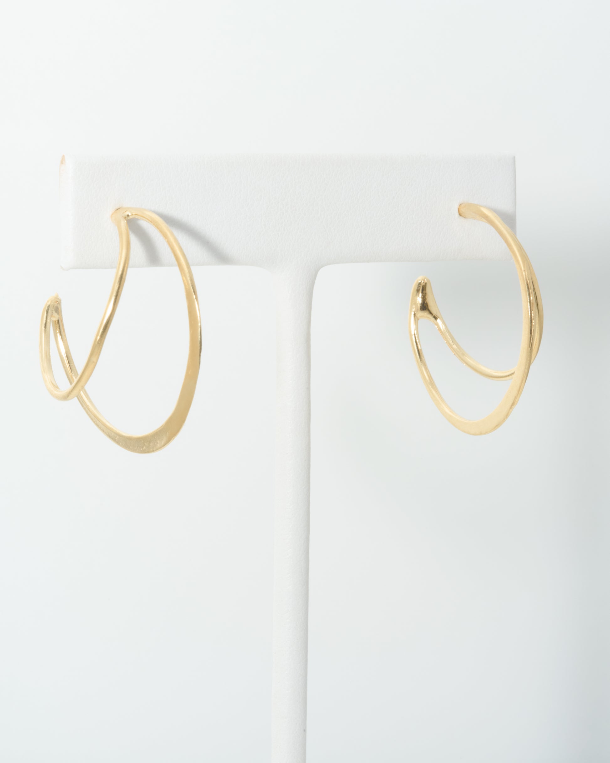 Made by Mountainside Jewelry, these gorgeous hoop earrings are composed of two tilted hoop shapes, one larger and one smaller. The positioning of the double hoops gives this pair of earrings more dimension while remaining lightweight enough for everyday wear. The finish is a lovely gold vermeil.