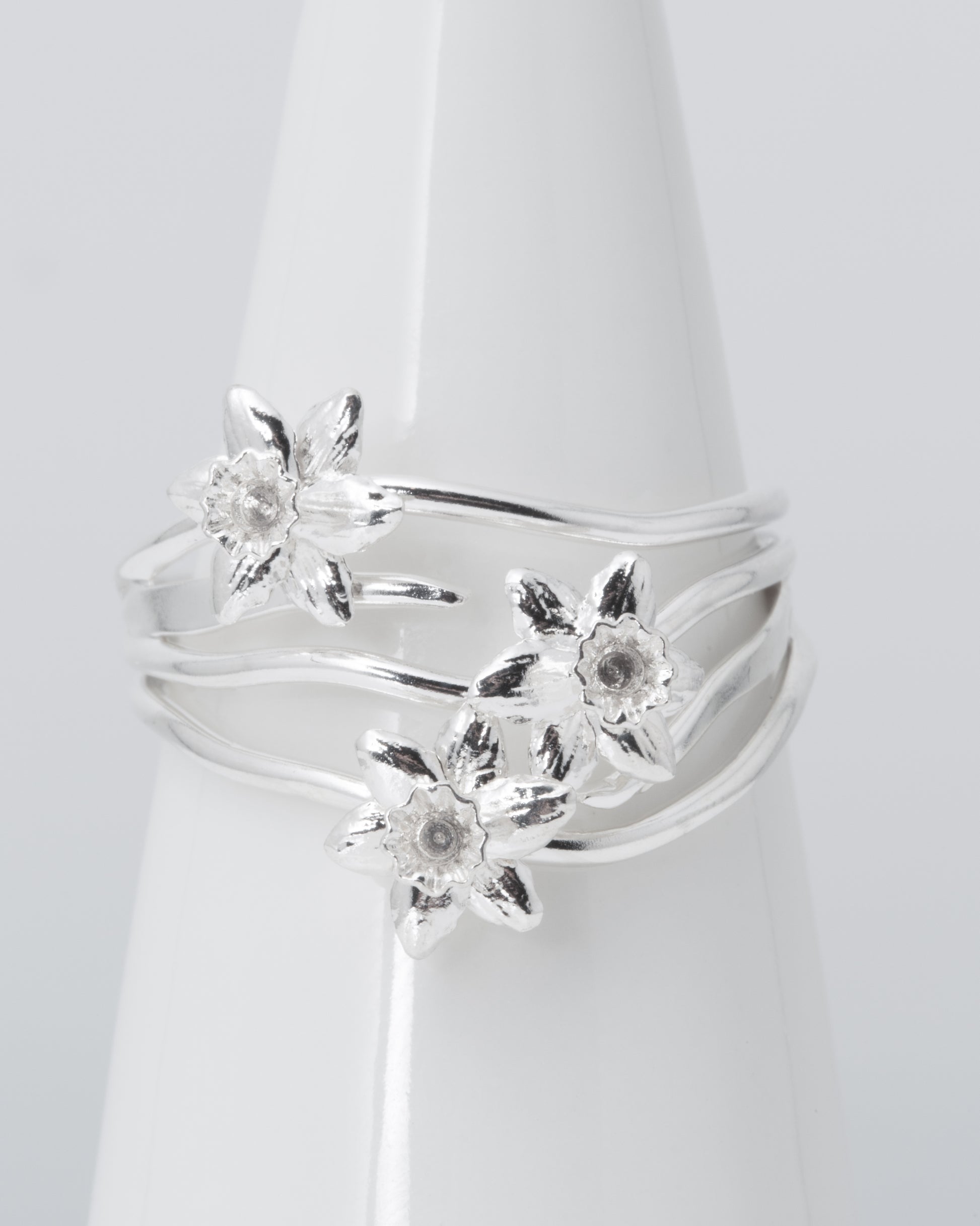 Handcrafted by Abigail Leaventon, this beautiful sterling silver ring features a design of three asymmetrically stacked daffodils. The stems are organically curved, and the positioning and spacing make it appear similar to a stack of three rings. The spaced out flower stems converge at the back of the ring band. This ring can be resized upon request.