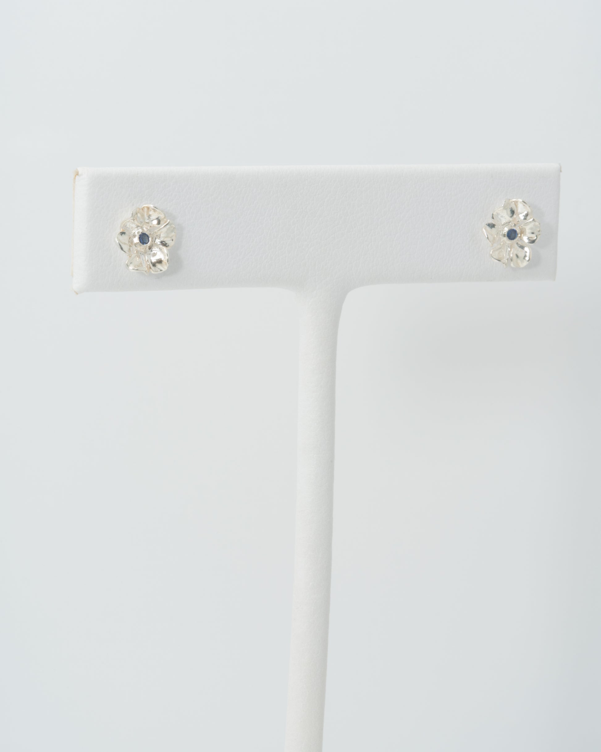 Handcrafted by Abigail Leaventon, these earrings are shaped like petite silver geraniums. The center of each flower has a gorgeous blue sapphire. These earrings are solid sterling silver with a simple post back.